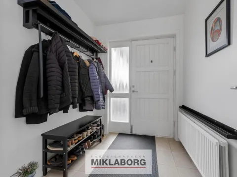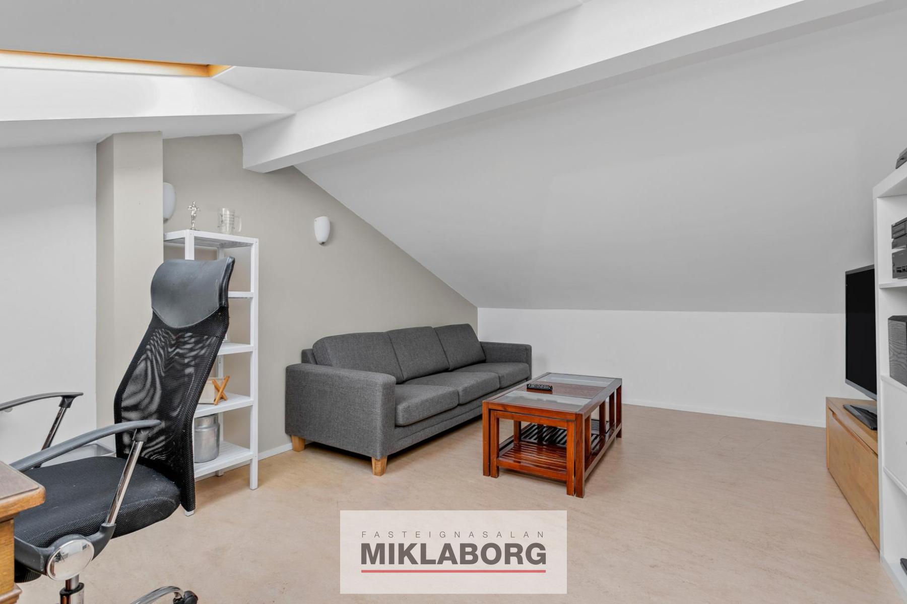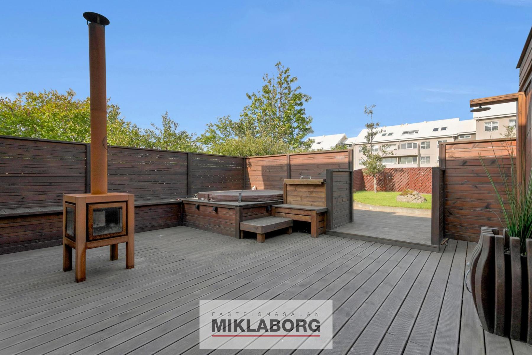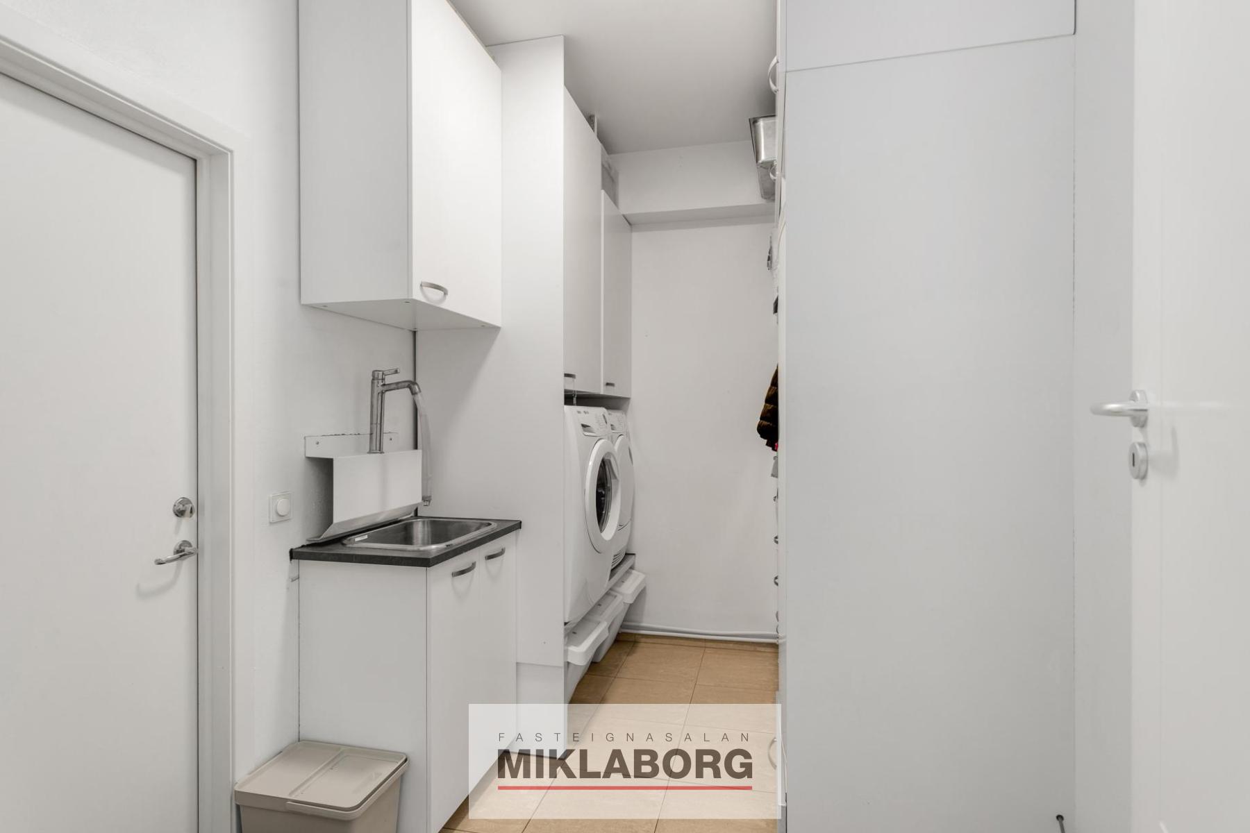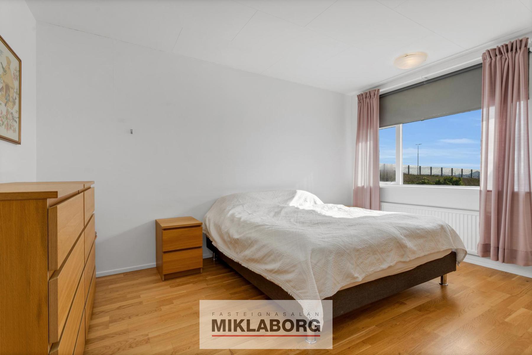 Miklaborg kynnir: Raðhús á tveimur hæðum með innbyggðum bílskúr Á neðri hæðinni er forstofa, eldhús, baðherbergi og stofa. Á efri hæðinni eru 4 svefnherbergi, sólstofa og baðherbergi auk herbergis í innréttuðu risi.