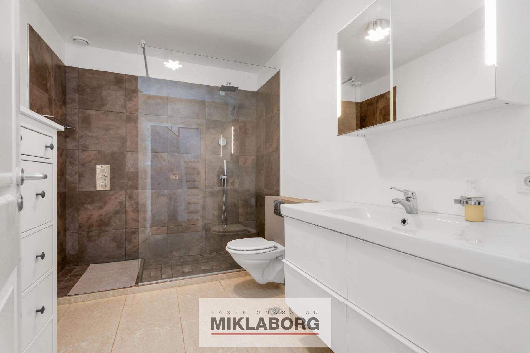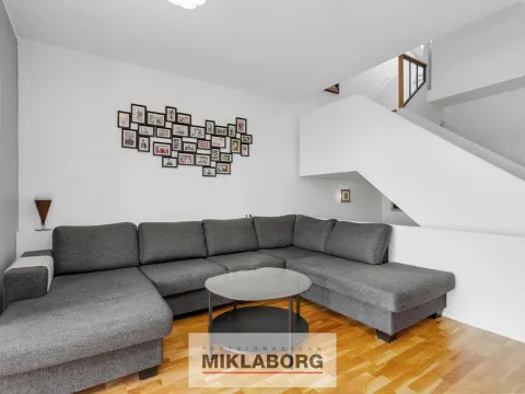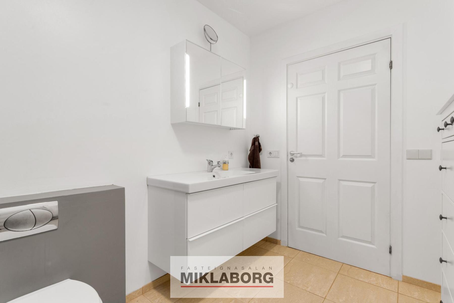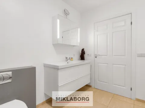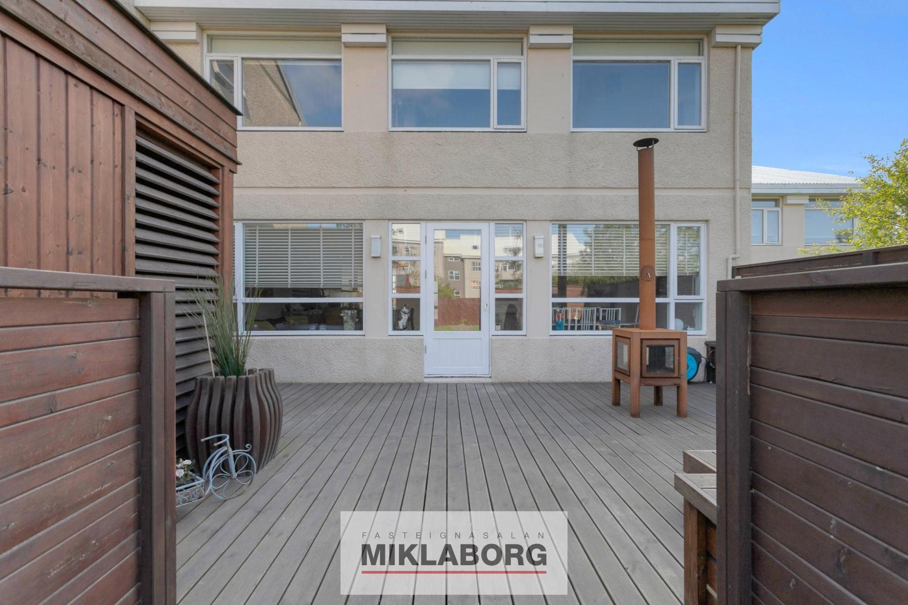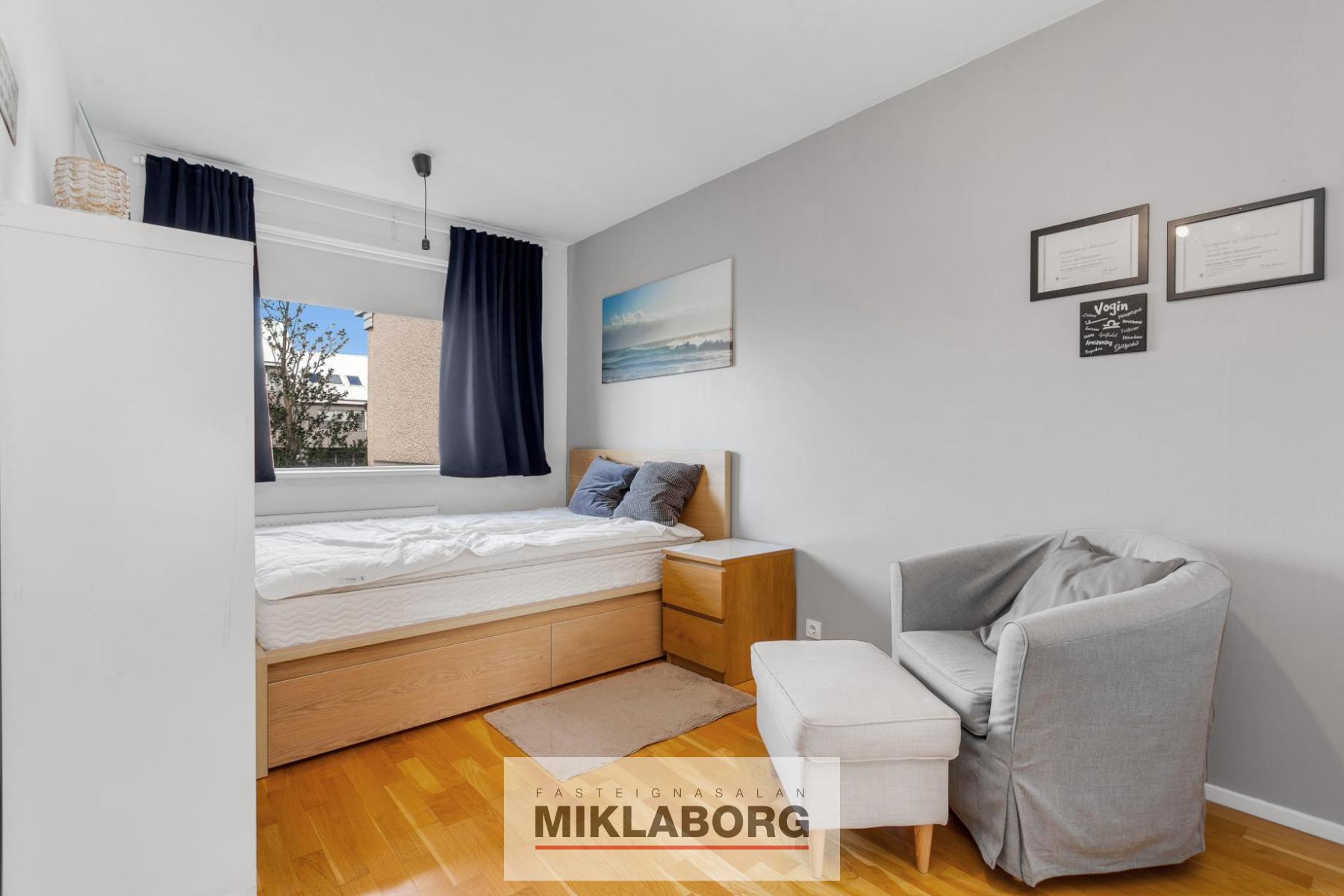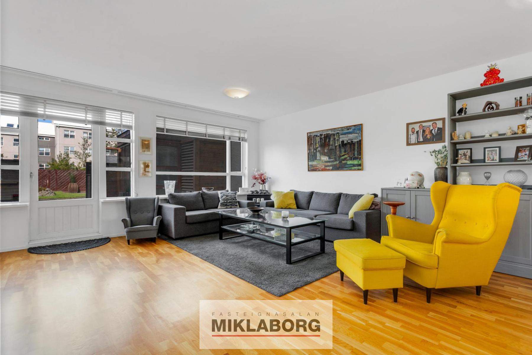 Miklaborg kynnir: Raðhús á tveimur hæðum með innbyggðum bílskúr Á neðri hæðinni er forstofa, eldhús, baðherbergi og stofa. Á efri hæðinni eru 4 svefnherbergi, sólstofa og baðherbergi auk herbergis í innréttuðu risi.