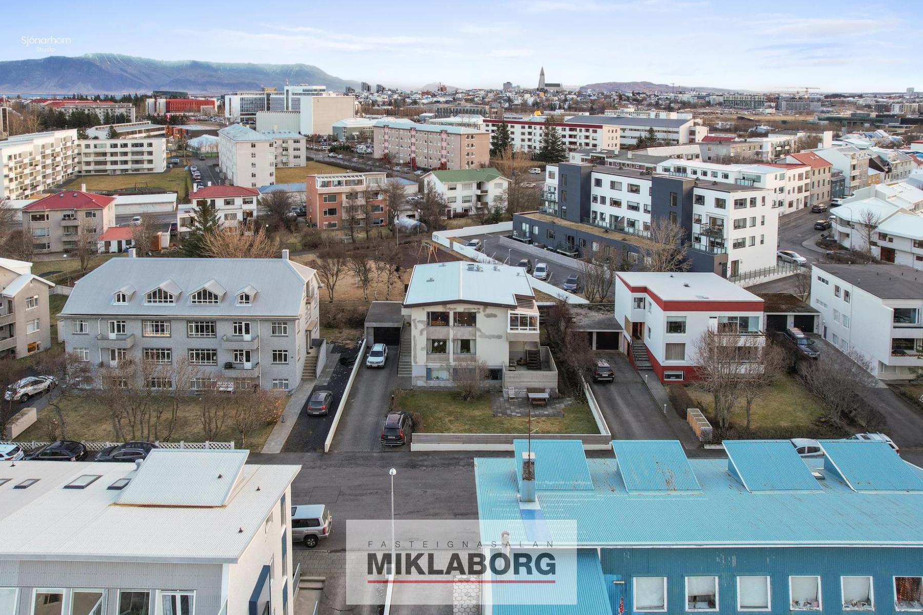 Búið að útbúa stúdíóíbúð í hluta bílskúrs. Íbúðin skiptist í alrými sem samanstendur af einföldu eldhúsi, svefnaðstöðu, stofu og baðherbergi. Íbúðin er með gluggum sem vísa inn í bakgarð,