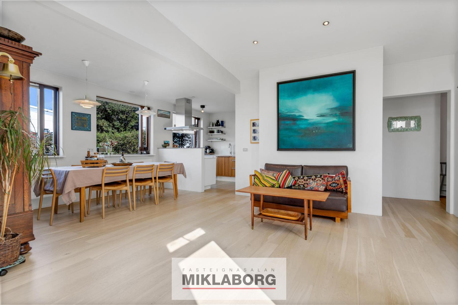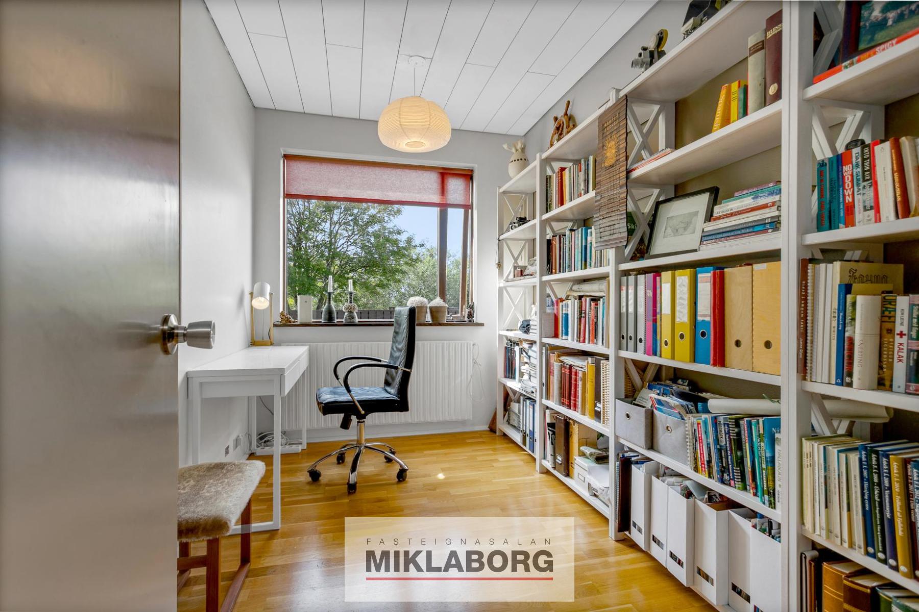 Á efri palli tekur við stór stofa með síðum gluggum. Auðvelt væri að útbúa herbergi innaf stofunni þar sem nú er bóka- og sjónvarpshorn.