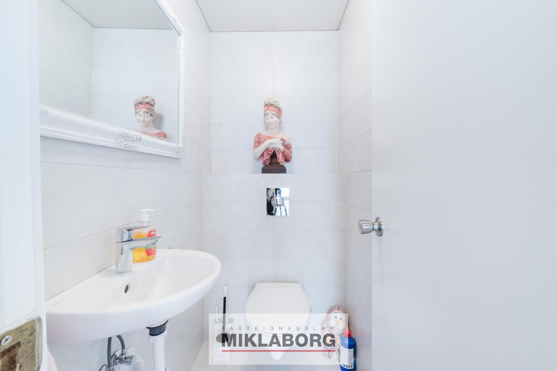 Nánari lýsing: Neðri hæð: Komið inn í anddyri með fatahengi. Gestasnyrting með upphengdu salerni.