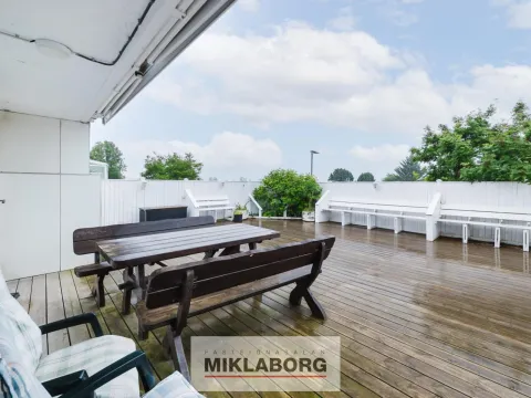 Stofa er með nýlegu harðparketi og gengt frá henni út á mjög stóra verönd.