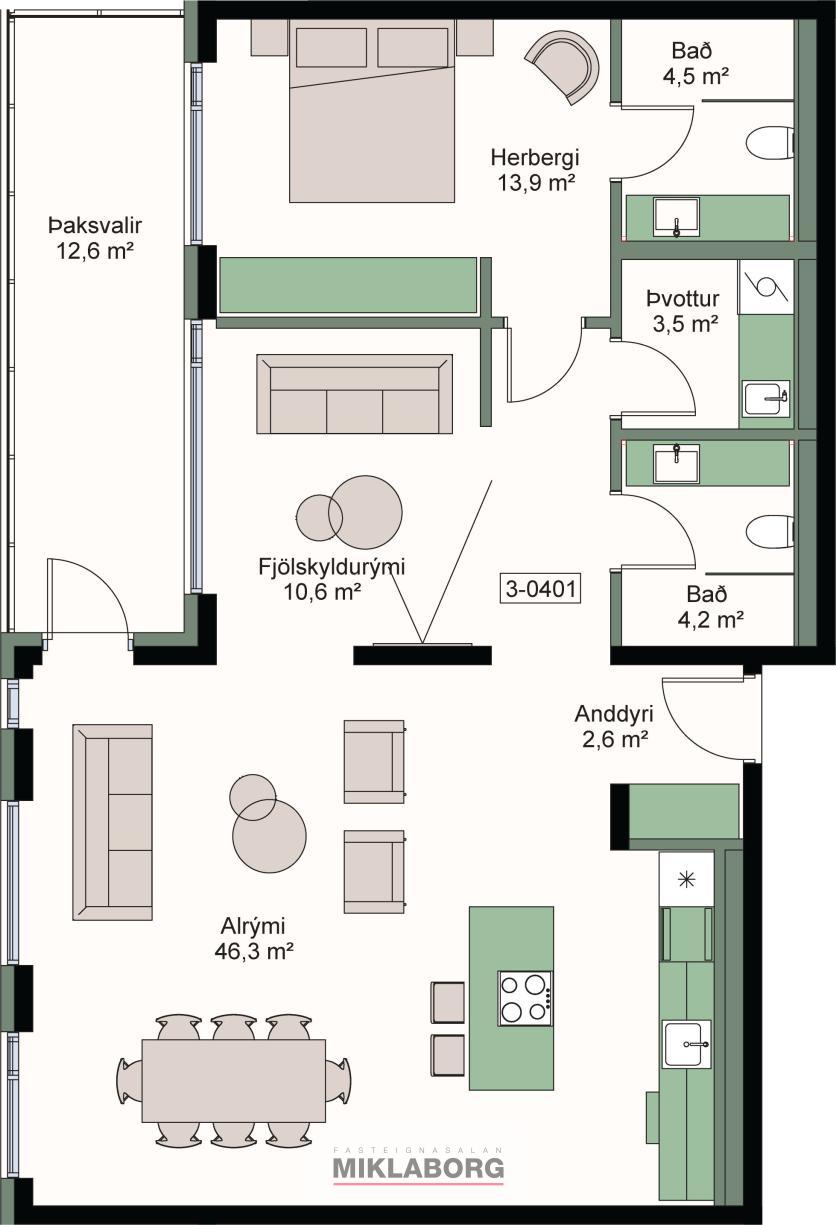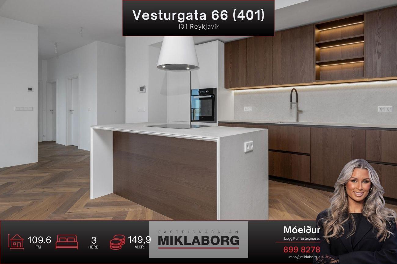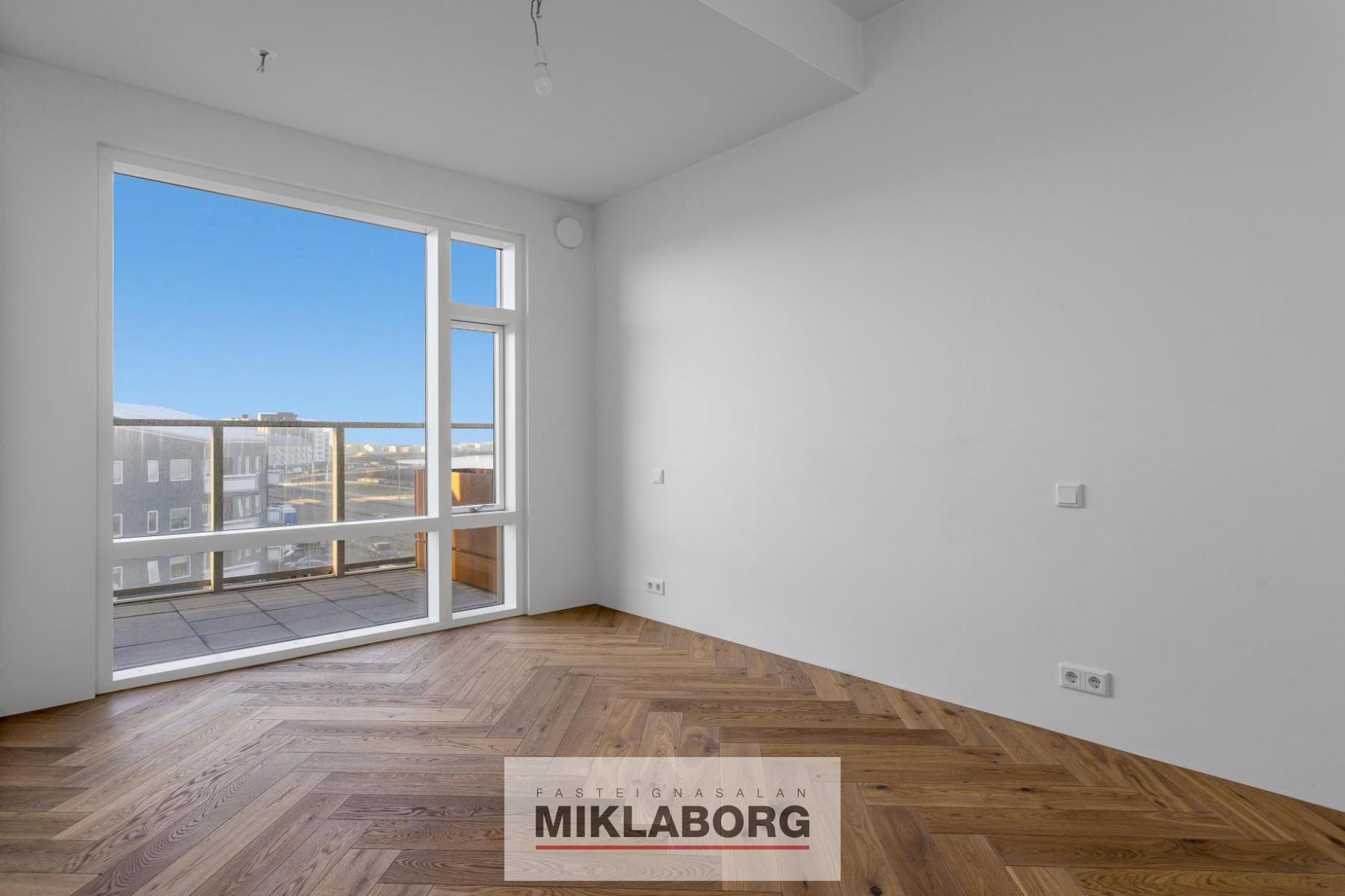 Nánari lýsing: Íbúð 401 er vönduð og einstaklega falleg 2–3ja herbergja íbúð á 4. hæð, þar sem lögð hefur verið rík áhersla á gæði, birtu og vel nýtt rými.