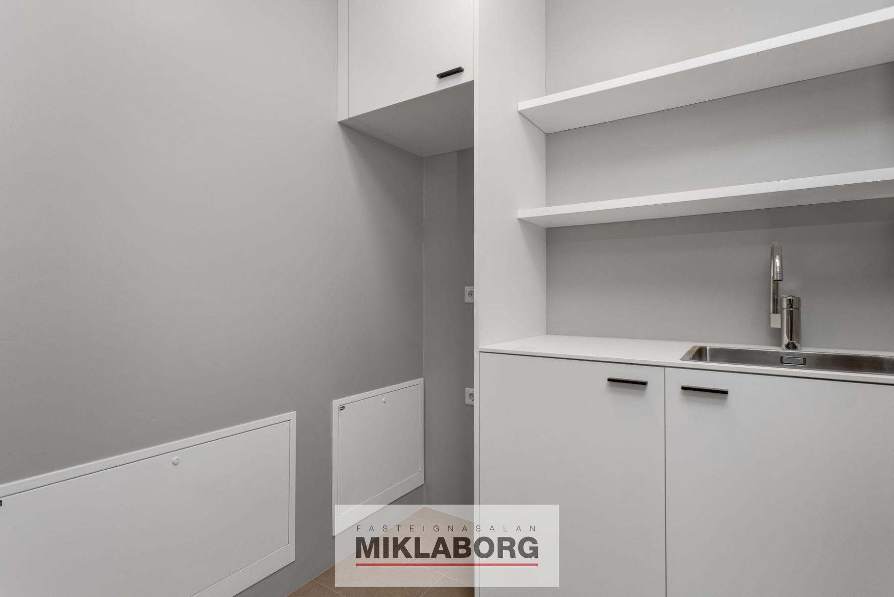 Forstofa með miklu skápaplássi. Stofa og borðstofa mynda hlýlegt og opið alrými með eldhúsinu. Stór eldunareyja með mikið skápapláss og frábærar suð-vestur svalir með útsýni yfir til Snæfellsjökuls þegar skyggni er gott.