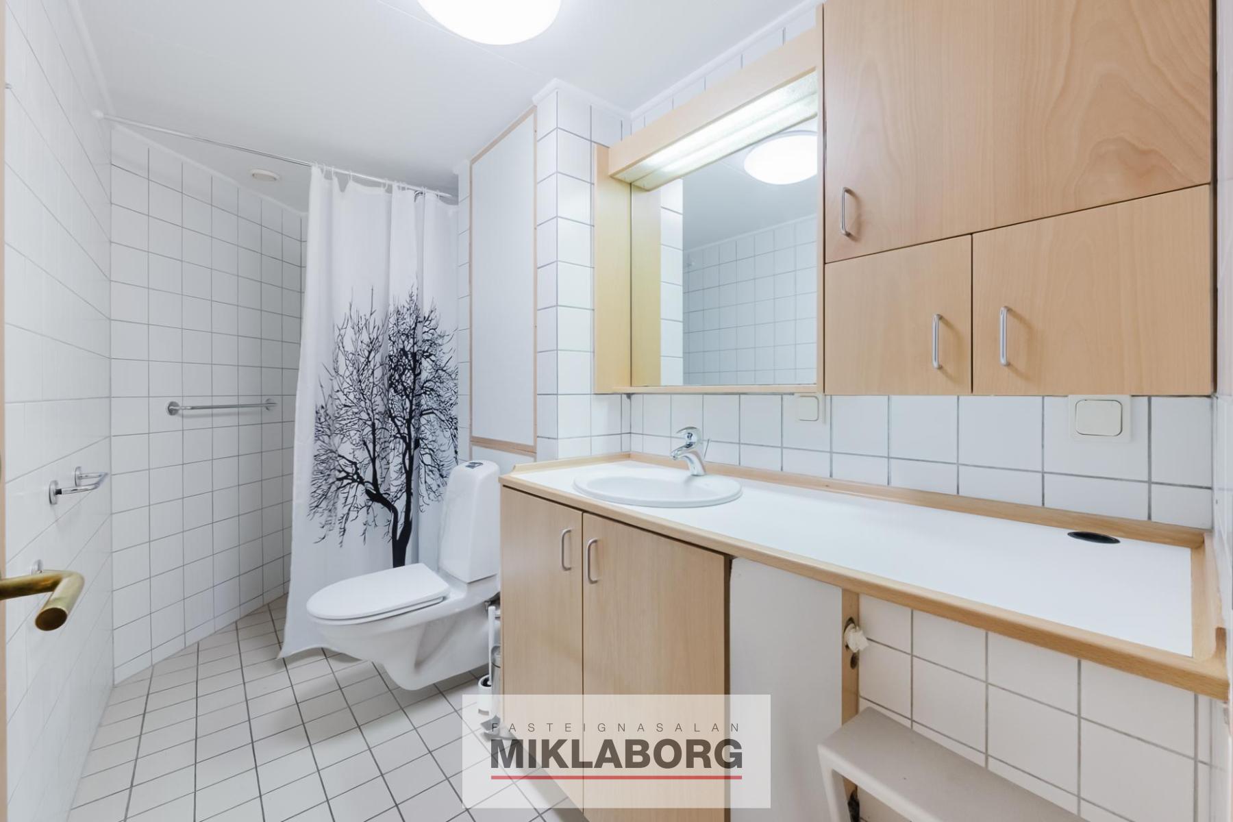 Nánari lýsing: Komið á parketlagðan gang með fataskáp. Frá gangi er gengt í flísalagt baðherbergi með sturtu. Vaskur er í innréttingu ogþÞar er tengi fyrir þvottavél.