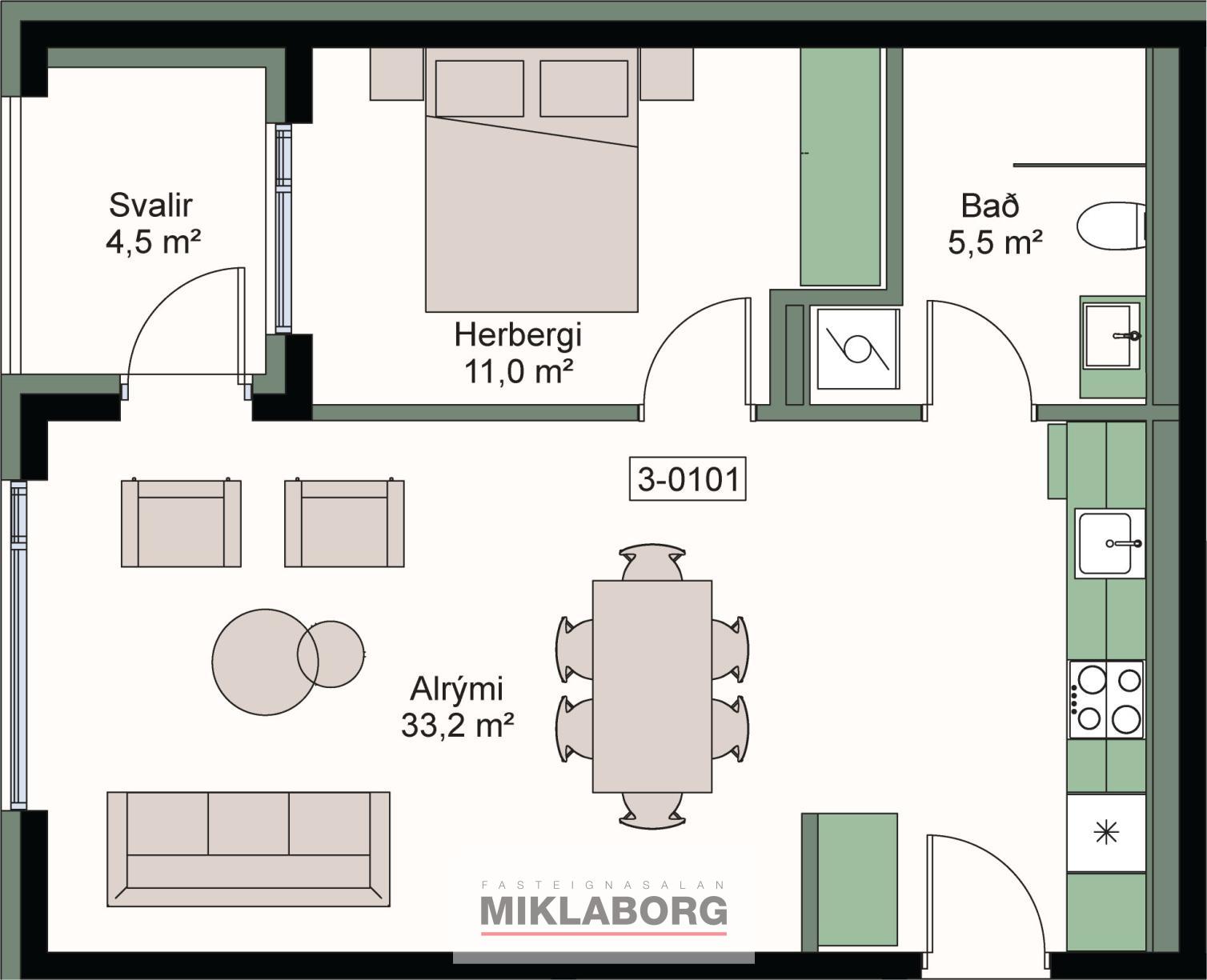 Íbúð 101 er 2ja herbergja íbúð á 1. hæð með svalir til suðvestur. Íbúðarrýmið skiptist í stofu með opnu eldhúsi . Svefnherbergi með fataskápum. Baðherbergi með sturtu og innan þess er gert ráð fyrir þvottavél og þurrkara. íbúðin er skráð 61 fm með geymslu sem er 8,8 fm.