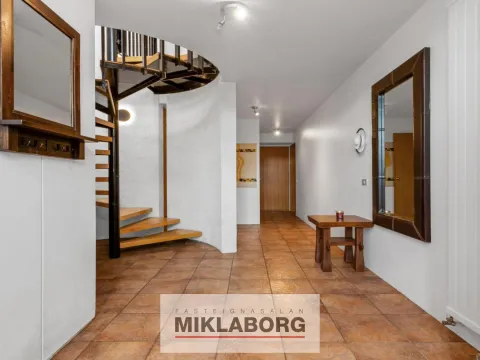 Inngangur er á neðri hæðinni í rúmgott hol, gengið er um hringstiga í miðju húsi upp á efri hæð og einkennir stiginn báðar hæðir hússins. Við taka sjónvarpsstofa, setustofa með arni og borðstofa. Svalir eru út frá setustofu. Eldhús með upprunalegri innréttingu og tækjum snýr að baklóð og er aðgengilegt bæði frá borðstofu og gangi. Baðherbergi er endurnýjað og er þar sturtuklefi með glerlokun, upphengt salerni, innrétting með vask. Baðherbergið er flísalagt að hluta. Hjónaherbergi með fataskápum og útgengi út svalir. Tvö önnur herbergi hafa verið sameinuð í eitt stórt og eru þar fataskápar. Útgeng er frá gangi út í garð á baklóð. Neðri hæð skiptist í herbergi, snyrtingu sem er flísalögð að hluta, innrétting með vaski. Þvottahús með flísum á gólfi, vinnuborð með vask, sturtuklefi í horni þvottahússins. Útengt er úr þvottahúsi út á lóð. Bílskúr er notaður sem herbergi/tómstundarrými aðgengilegur frá þvottahúsi. Sér 2ja herbergja íbúð er aðgengileg frá frá holi og hægt að nýta hana með aðalíbúðinni en hún er einnig með sérinngangi. Hún skiptist í litla forstofu með fataskápum, stofu með stórum gluggum, lítið eldhús með snyrtilegri eldri innréttingu, svefnherbergi með fataskápum og baðherbergi sem er flísalagt að mestu en þar er upphengt salerni, lítil innrétting með vask og sturtuklefi.