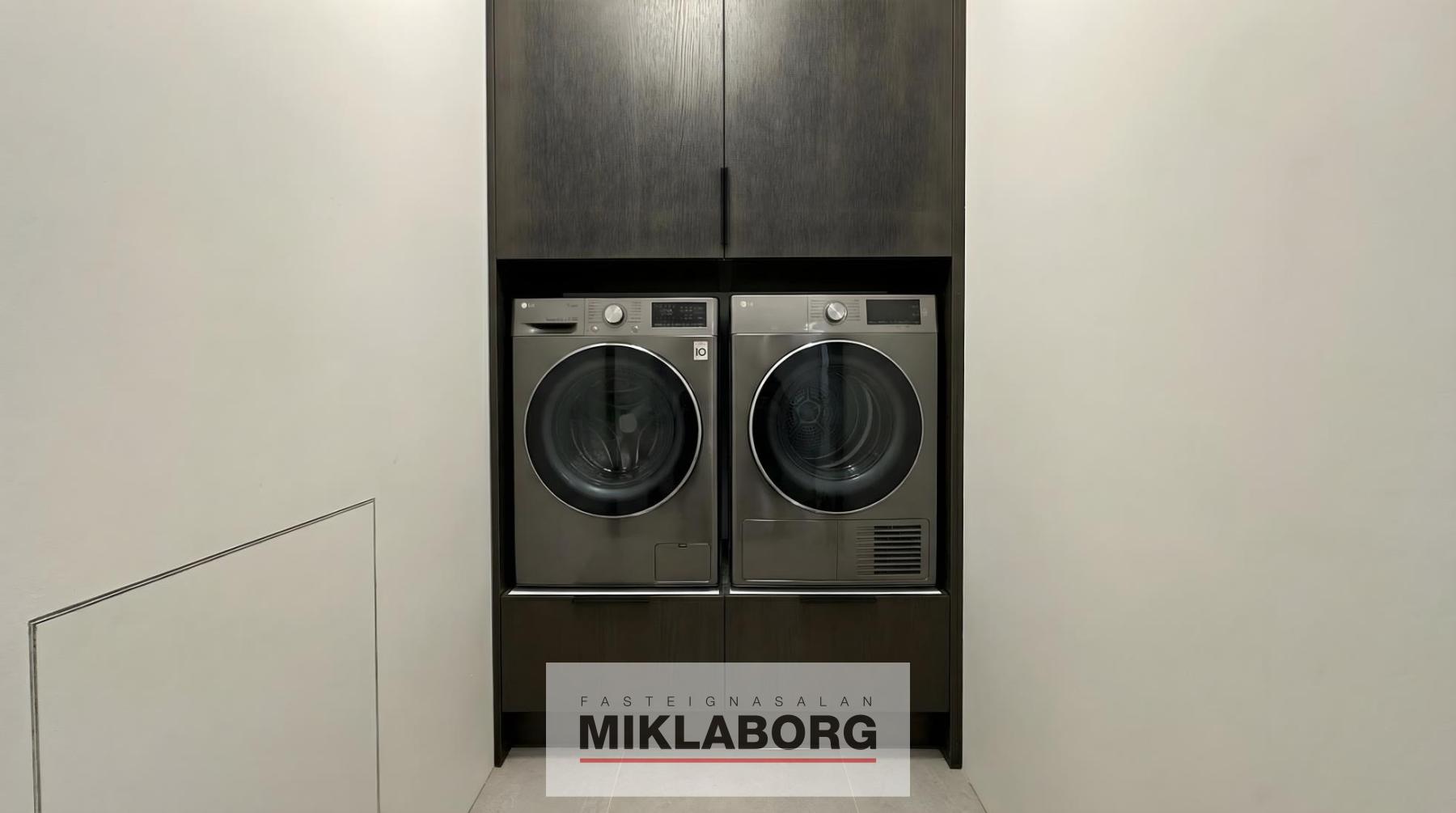 Baðherbergi/Þvottahús: Tvö baðherbergi, annað inn af forstofu og hitt í hjónasvítu. Stæði fyrir þvottavél og þurrkara inn á öðru þeirra. Fallegar flísar á gólfi og veggjum að hluta til. Vegghengd salernisskál, walk-in sturta, handlaug felld ofan í borðplötu.