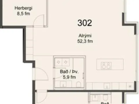 Íbúð 302: Glæsileg 3ja herbergja íbúð á efstu hæð, skráð stærð er samtals 176,4 fermetrar. Þar að auki eru tvær þaksvalir í sitthvorum enda íbúðarinnar.
